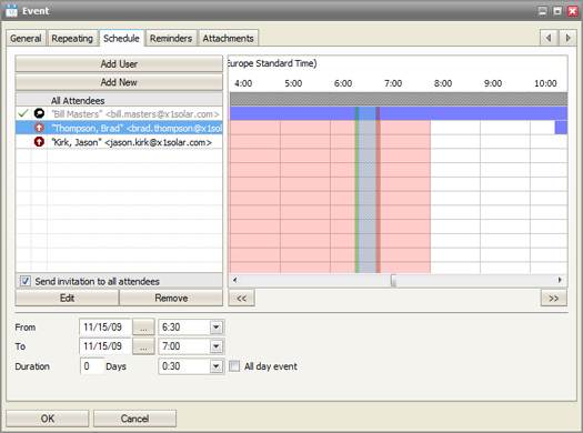 Calendars and tasks offer meeting planning with other participants with availability, timezone support, invitations and new/updated/declined/accepted notifications. Meeting scheduling brings users from any platform together- it is supported in WebClient, Outlook, Desktop Client and other CalDAV applications, in mobile Exchange ActiveSync and through external Free/Busy URL. Multiple IceWarp/Oracle/Apple servers can communicate with each other via iSchedule. Inviting multiple participants regularly is as easy as adding a distribution list.